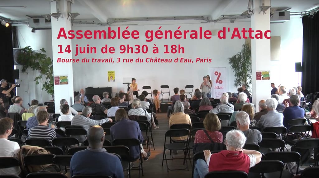 L’Assemblée générale d’Attac se déroulera le 14 juin de 9h30 à 18h à la Bourse du travail, 3 rue du Château d’Eau, à Paris (métro République)