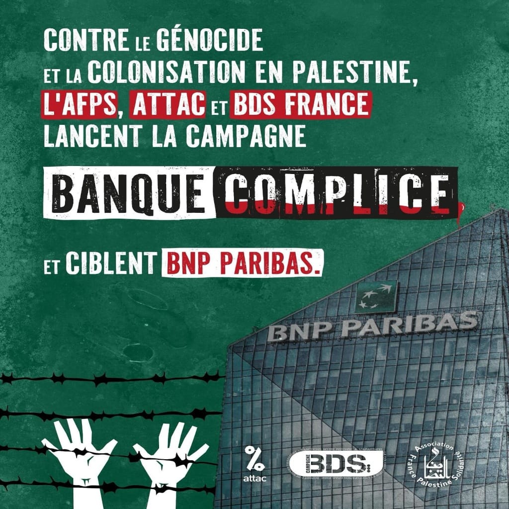 Contre le génocide et la colonisation en Palestine, l’AFPS, Attac et BDS France lancent la campagne « Banque complice » et ciblent BNP Paribas..