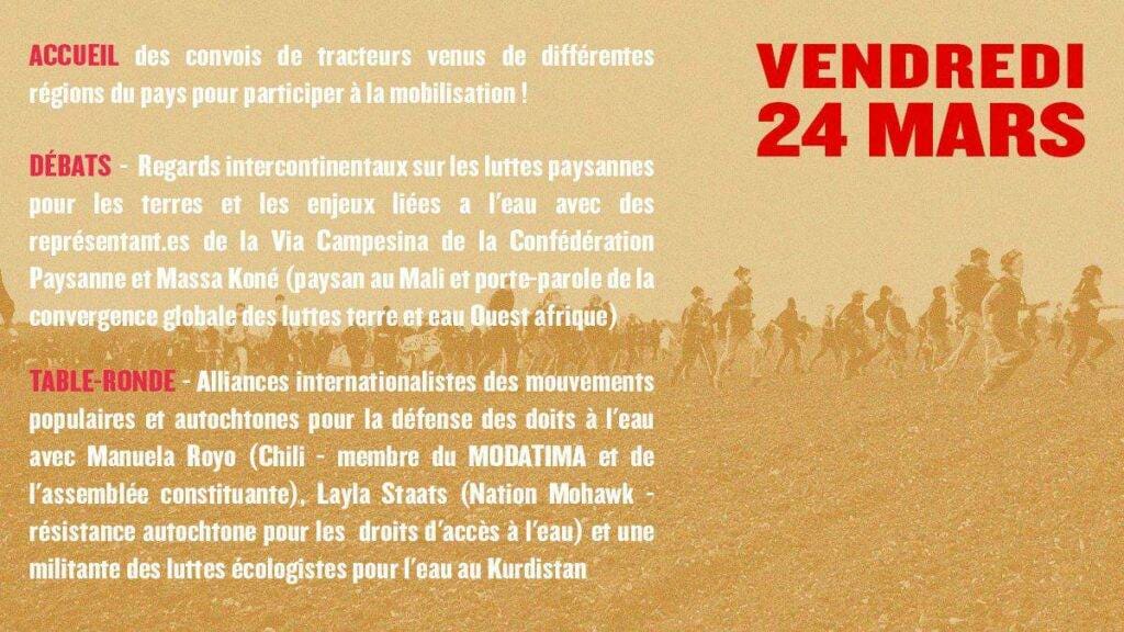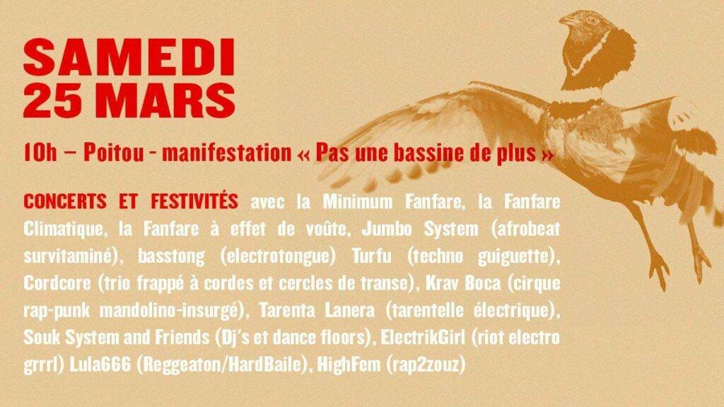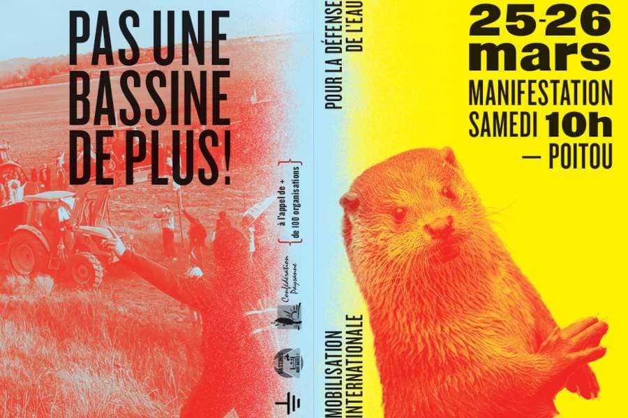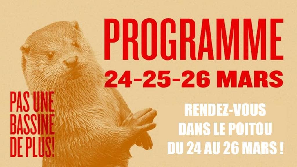 Retrouvons-nous dans le Poitou du 24 au 26 mars aux côtés des Soulèvements de la Terre, de Bassines Non Merci et de la Confédération Paysanne pour arrêter ces chantiers climaticides et organiser la défense collective de l’eau.